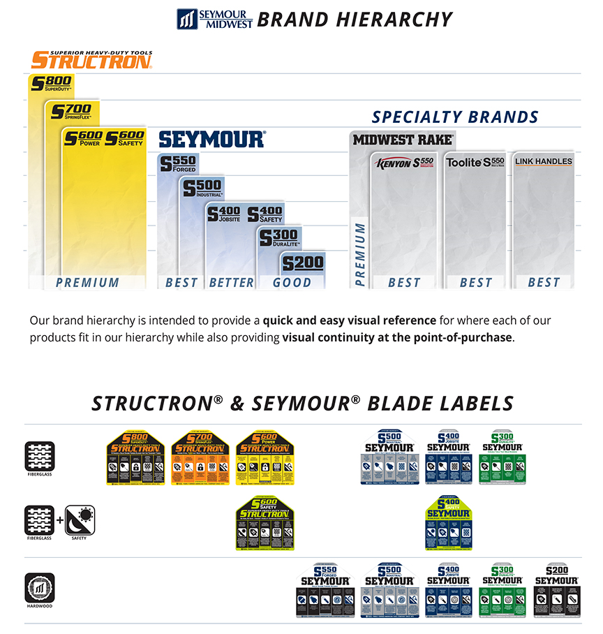 The above blade labels illustrate the Difference is Real™! attributes for Structron® and Seymour®, our two primary long-handled tool brands. Additionally, the blade labels summarize the Fiberglass, Safety and Hardwood options available by series.